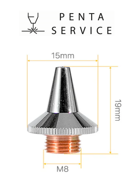 Сопло PENTA SERVICE, диаметром 15 мм, имеет диаметр отверстия 1,4 мм, произведено из меди с соблюдением всех необходимых стандартов качества, технических и геометрических параметров изделий данного типа. В результате применения, сопло гарантирует сохранение расчётных параметров в течение длительного времени и обеспечивает высокую мощность работы оборудования лазерной резки. Электролитическое хромирование поверхности сопла максимизирует срок эксплуатации, сокращает адгезию при разбрызгивании и обеспечивает стабильное определение высоты.