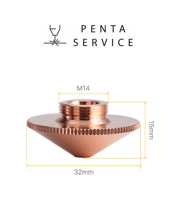Сопло PENTA SERVICE высотой 15 мм, диаметром 32 мм, имеет диаметр отверстия 5,0 мм и резьбу М14, произведено из меди с соблюдением всех необходимых стандартов качества, технических и геометрических параметров изделий данного типа. В результате применения, сопло гарантирует сохранение расчётных параметров в течение длительного времени и обеспечивает высокую мощность работы оборудования лазерной резки.